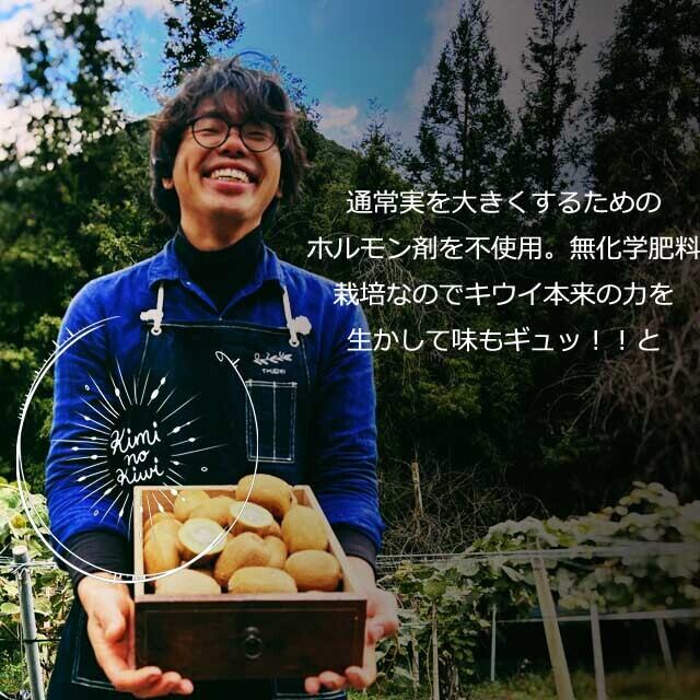 愛媛県の瀬戸内の豊かな環境で育った人にも環境にもやさしいキウイフルーツ『キミのキウイ』実を大きくするために使うホルモン剤や化学肥料や農薬を使わない栽培で本来のキウイフルーツの力を大切に栽培をして安心して食べていただけるようなキウイフルーツを目指しています。ホルモン剤など実を大きくするために力を使っていないためギュッ~っと!つまった味のキウイフルーツです。